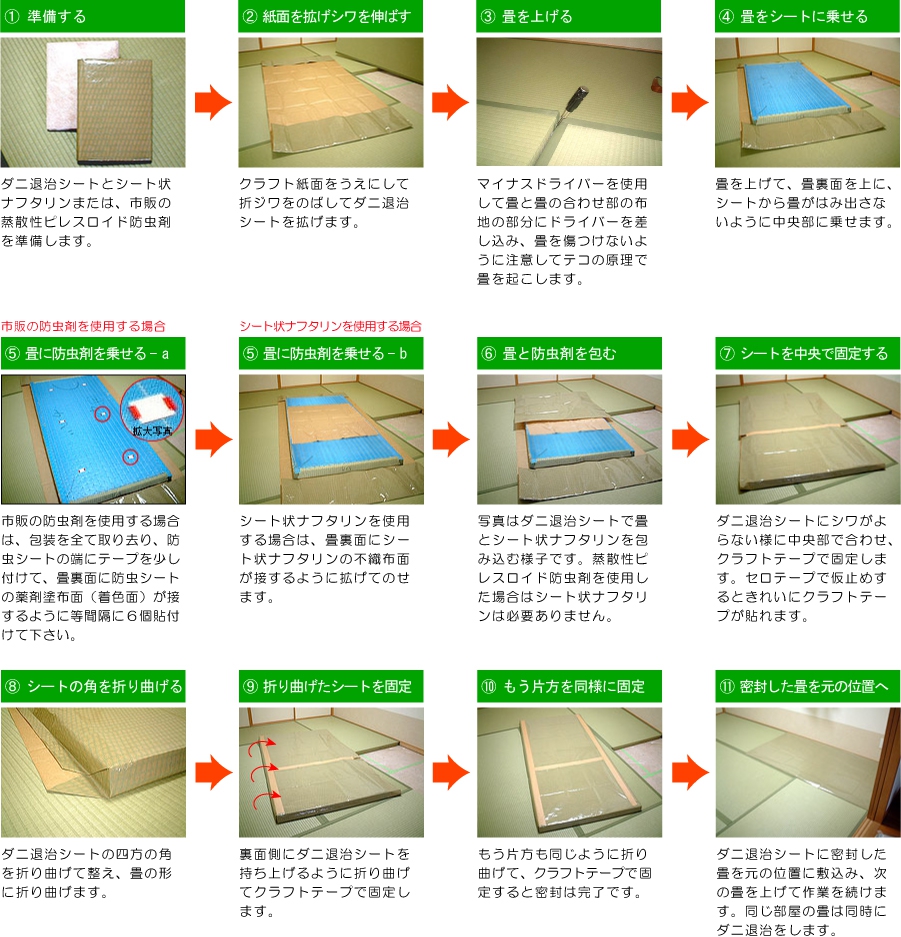 ※シートを開け畳を出す際には畳の表面にダニの死骸が沢山出ているはずですので、作業時は窓を開け換気を良くし、